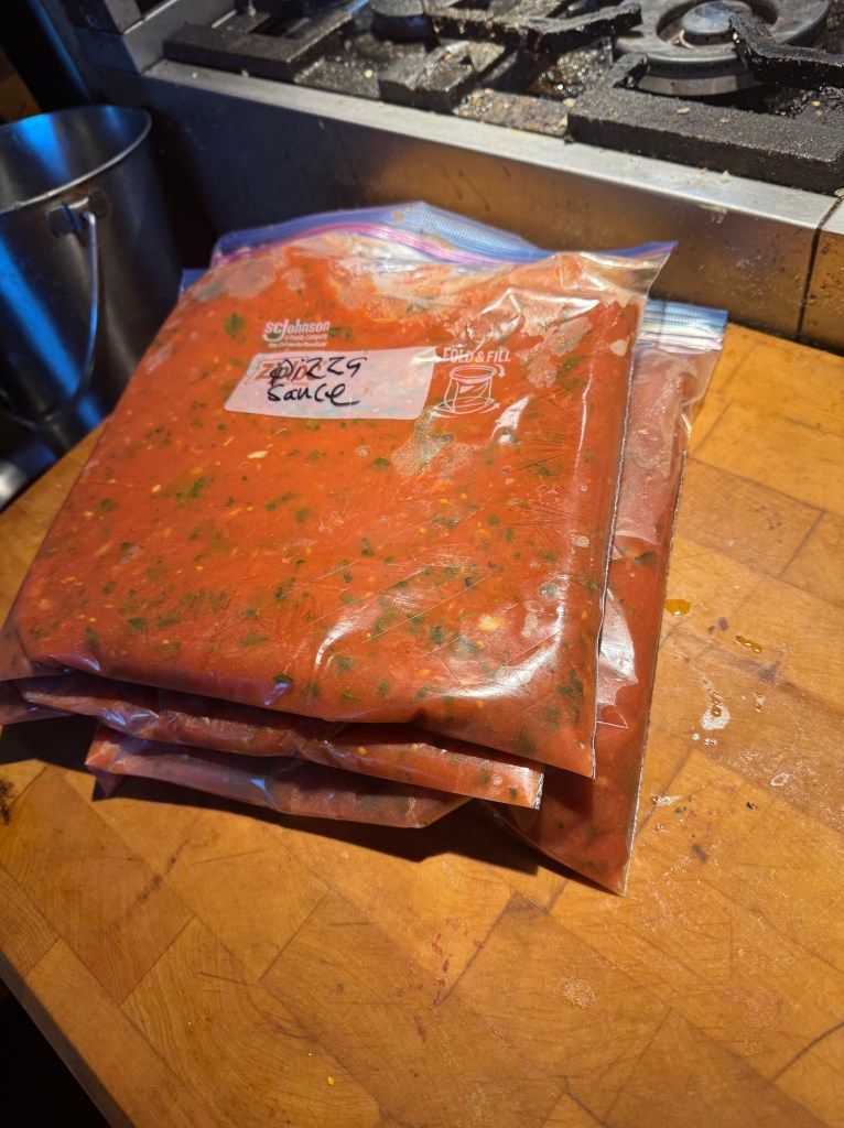 6. I like to store the sauce in my deep freeze in two or three separate gallon-freezer bags, with the finished pizza sauce spread out relatively flat across the whole bag; then, I break off as much as I need for an individual pizza and thaw it in the microwave or simply on the counter in a small bowl. You should plan on about three-quarters of a cup for a twelve-inch pizza. If the weeks go by and you have not made enough pizza, switch to using this sauce as marinara, with any pasta and with any additional ingredients, like meat.