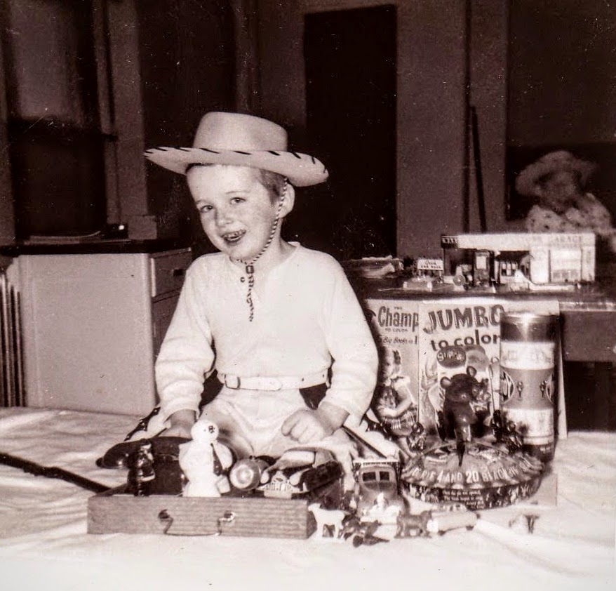 That musical tin pie at my side is one of the favorite toys of my life. I cranked a handle on the side, and a soft rubber strip with raised prongs played the melody of Sing a Song of Sixpence on metal strings within. Several blackbirds popped out of slots on top of the pie when the music ended. Here, my family has visited me in the sanatorium and brought me presents. I was a sugar addict, and we were born with soft teeth: My top row of baby teeth are largely decayed. I was happy, though. I didn’t care. The white border of this photo, which I cropped, reads at the top 1954, and at the bottom Johnny.